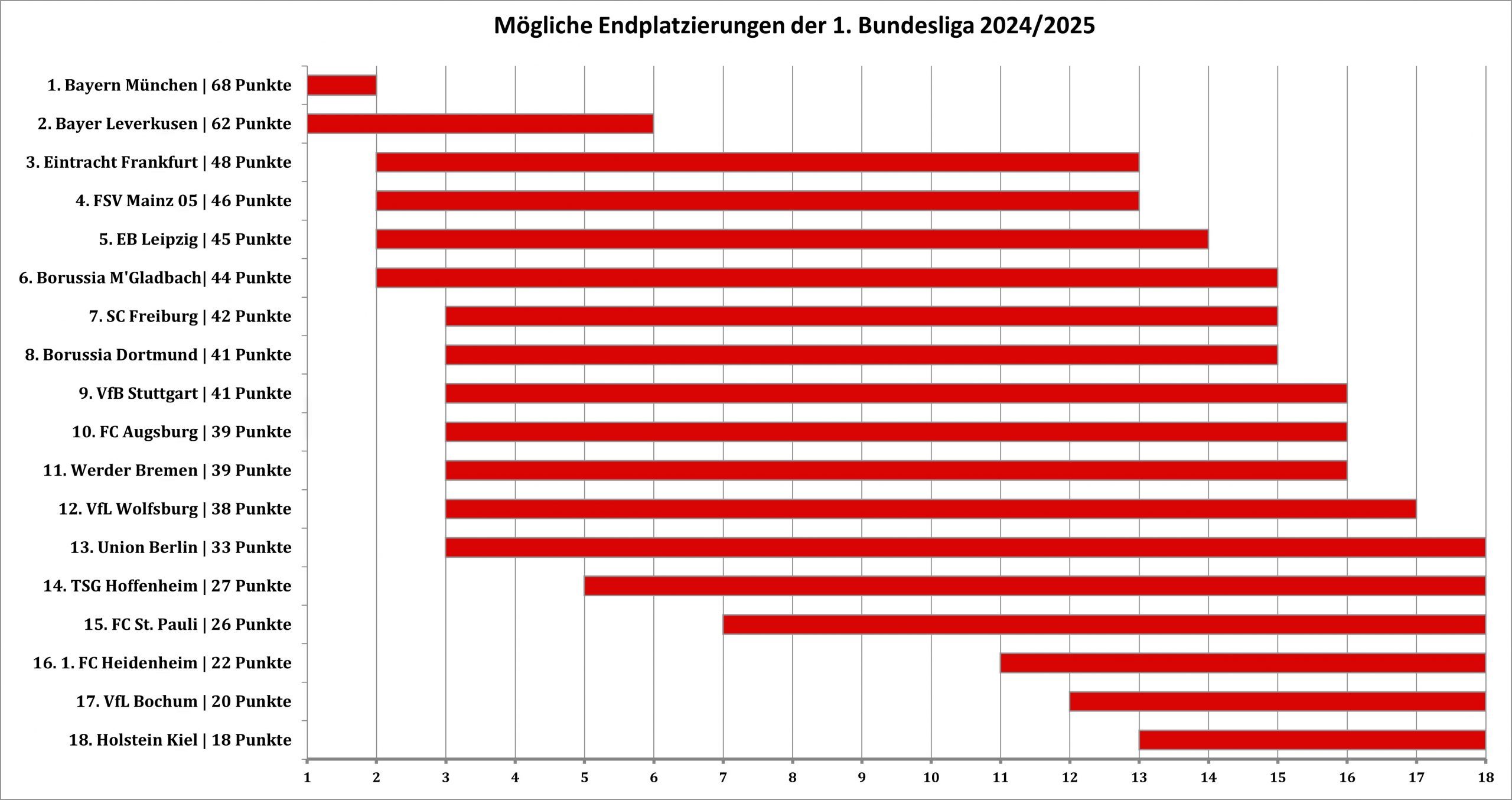 Potenzielle Endplatzierungen – schlechter als Platz 13 wird es nicht: Der Endspurt in der Bundesliga steht an. Schafft es Eintracht Frankfurt einen Platz unter den ersten Vier zu verteidigen und erstmals über den Ligabetrieb in die Champions League einzuziehen? Theoretisch ist es zumindest auch noch möglich ins Niemandsland der Tabelle durchgereicht zu werden. Irgendwo zwischen Platz 2 und 13 wird Frankfurt am landen, so viel ist sicher. Den Kampf um die Meisterschaft machen wie im vergangenen Jahr nur noch Bayern München und Bayer Leverkusen unter sich aus. Einen direkten Abstiegsplatz können noch alle Vereine ab Platz 12 (VfL Wolfsburg) erreichen.