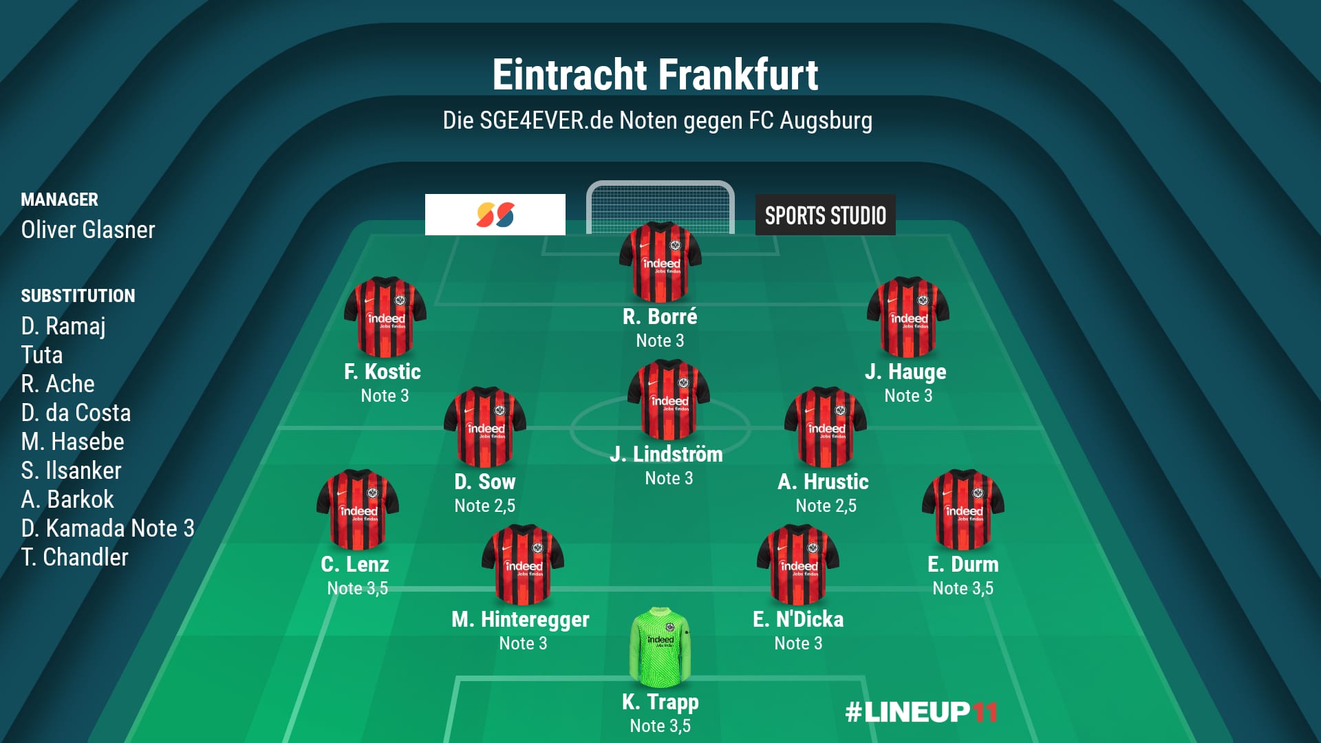 – Spieler des Spiels – Djibril Sow: Seine Übersicht und seine Qualität als Box-to-Box Spieler stellt Djibril Sow Woche zur Woche unter der Beweis. Zuletzt ist aber vor allem sein persönlicher Anspruch als Führungsspieler immer deutlicher zu sehen gewesen. Immer häufiger übernimmt er Verantwortung auf und neben dem Platz, stellt sich vor seine Mitspieler und agiert als Stratege auf dem Platz. Das war gegen den Augsburg beeindruckend und wird mit der Auszeichnung Spieler des Spiels belohnt.