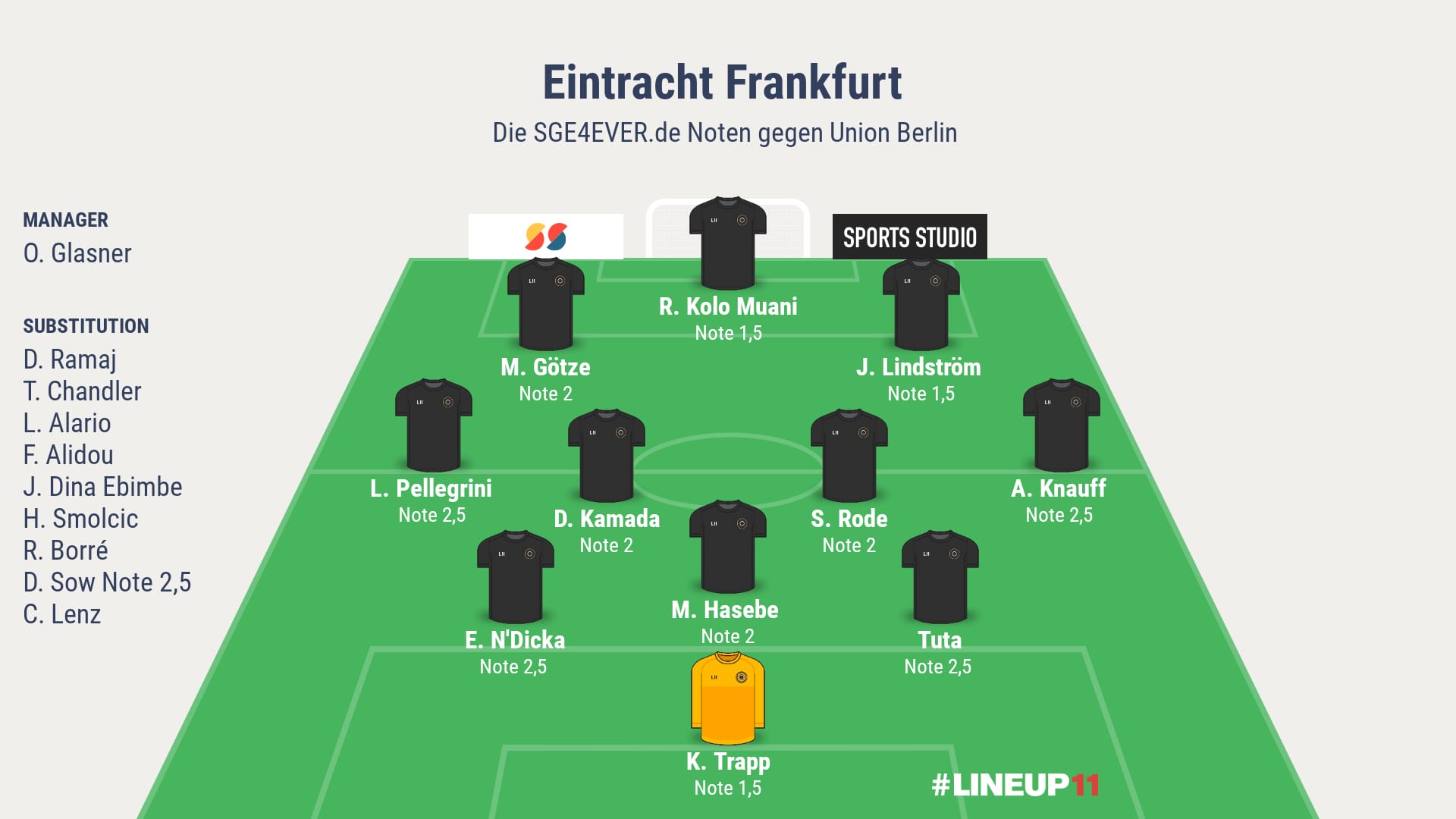 An der Leser-Bewertung gemessen, betrug die durchschnittliche Mannschaftsleistung gegen 1. FC Union Berlin der zwölfzensierten Spieler den Wert 2,08. Die Leistungen innerhalb einer Kategorie sind von oben nach unten zu bewerten. Der erste Spieler einer Kategorie hatte das beste Gesamtergebnis, der letzte Spieler das Schlechteste innerhalb der Kategorie. Die Einzelnoten der über 430 abstimmenden SGE4EVER.de-User im Überblick: