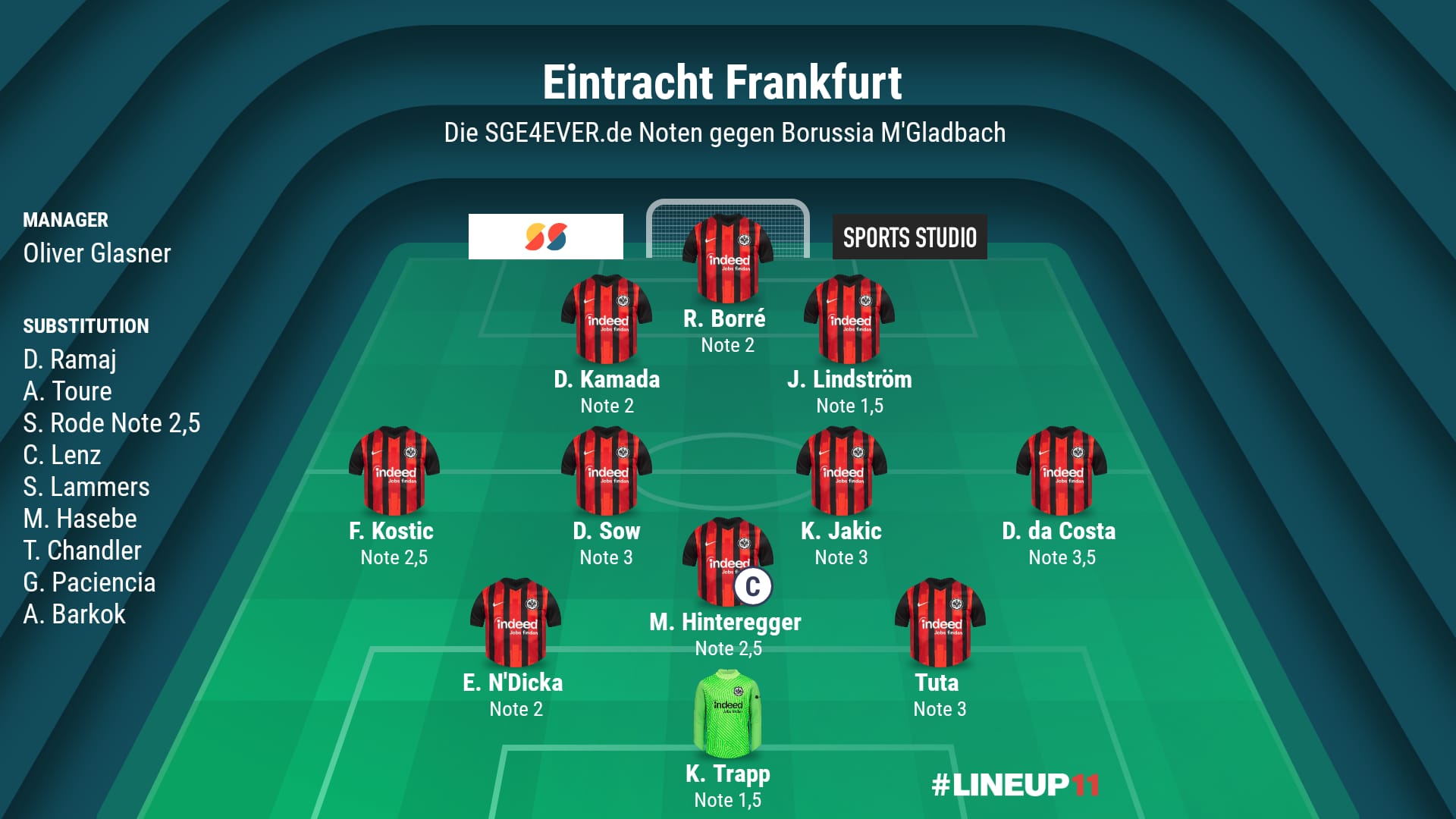 An der Leser-Bewertung gemessen, betrug die durchschnittliche Mannschaftsleistung gegen Borussia Mönchengladbach der zwölf zensierten Spieler den Wert 2,42. Die Leistungen innerhalb einer Kategorie sind von oben nach unten zu bewerten. Der erste Spieler einer Kategorie hatte das beste Gesamtergebnis, der letzte Spieler das Schlechteste innerhalb der Kategorie. Die Einzelnoten der über 480 abstimmenden SGE4EVER.de-User im Überblick:
