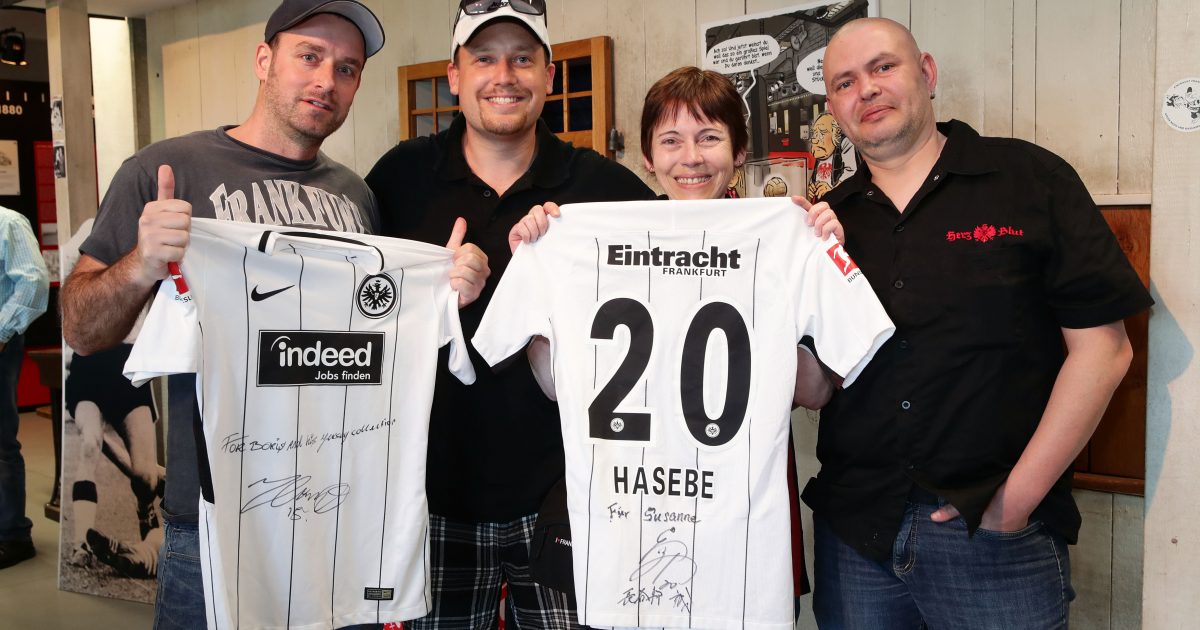 Vier Tage lang konnten die User bieten und überbieten. Am Ende fanden die Trikots zwei glückliche Abnehmer und insgesamt 1015,00 Euro landeten auf dem Konto der Frankfurter Arche! Die ersteigerten Trikots erhielten dann sogar noch eine persönliche Widmung auf Wunsch der Gewinner, die von den beiden Spielern zusätzlich zum Autogramm auf das ersteigerte Trikot geschrieben wurde. Die Übergabe fand dann vor dem Heimspiel gegen den Hamburger SV am vergangenen Samstag im Eintracht-Museum statt. Thomas Hilz aus Frankfurt nutzte die Gelegenheit und überraschte Freundin Susanne mit dem für sie signierten Hasebe-Trikot. Die ahnte von nichts und fiel im Museum aus allen Wolken. Und ihrem Freund mit Tränen in den Augen um den Hals. Boris Müller aus Köln hingegen nutzte die Auktion, um seine riesige Eintracht-Trikot-Sammlung (www.frankfurt-trikots.de) um ein weiteres Sammlerstück zu erweitern. Eine Win-Win-Situation für alle Seiten also.