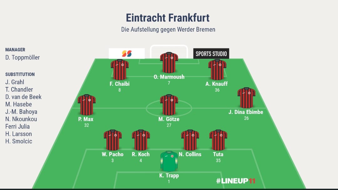 Auf der Frankfurter Bank nehmen Platz: Grahl (ETW), Hasebe, Smolcic, Chandler, Nkounkou, Bahoya, Chaibi, van de Beek, Nacho Ferri, Larsson