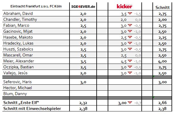 Marco Fabian betrieb einen sehr hohen Arbeitsaufwand. Keine Scheu vor defensiven Zweikämpfen und immer den Drang nach vorne gesucht. Zwar blieb ihm ein Scorerpunkt verwehrt, dennoch konnte der Mexikaner eine ordentliche Note 2,5 abgreifen. Omar Mascarell und Szabolcs Huszti reihen sich dort nahtlos ein. Viel Laufarbeit betrieben und die Kölner immer wieder beschäftigt. Bastian Oczipka hatte Glück, dass sein Handspiel in der 37. Minute nicht geahndet wurde. Ansonsten war er in der Offensive abermals eine treibende Kraft und erledigte sehr zufriedenstellend seinen Job.