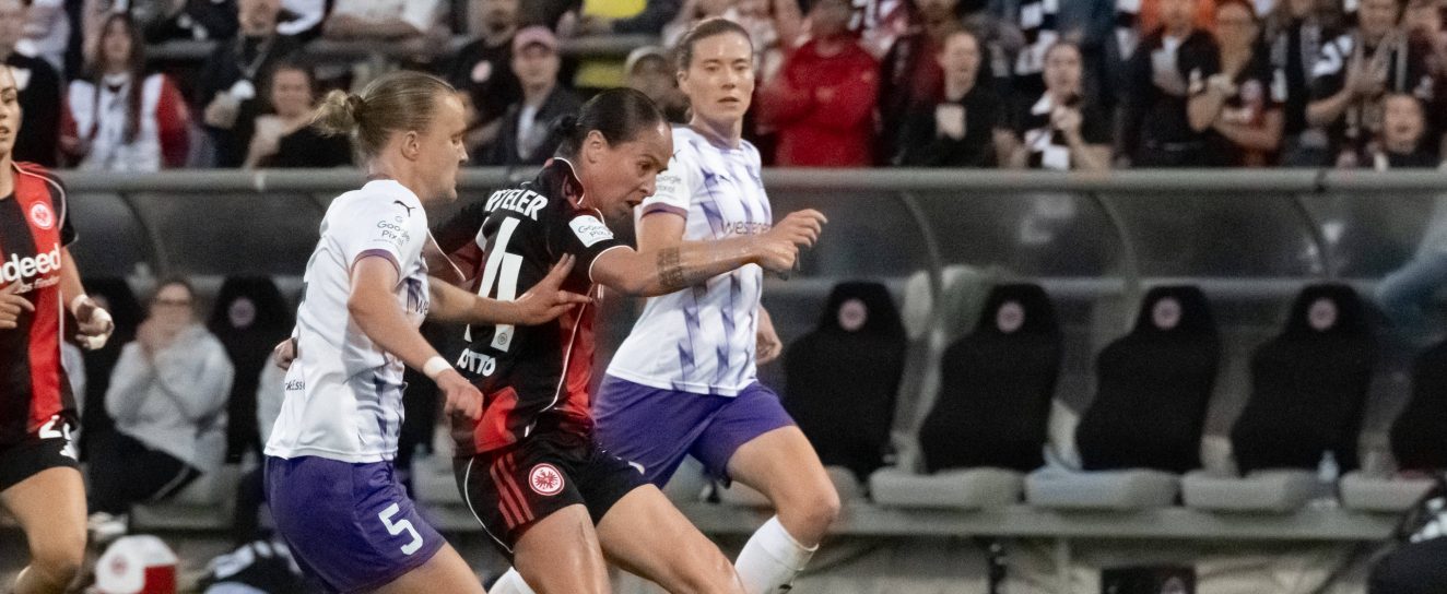 Auch danach blieb die SGE dran: Kapitänin Freigang vergab eine Riesengelegenheit (30.). Anyomi dribbelte bis an die Grundlinie und legte in die Mitte ab, wo die neue Spielführerin nur noch ins fast leere Tor hätte einschießen müssen. Allerdings missglückte ihr der Abschluss, der Ball ging drüber.