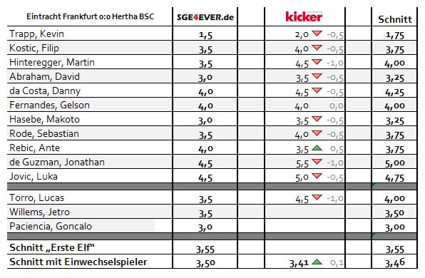 An der Leser-Bewertung gemessen, betrug die durchschnittliche Mannschaftsleistung gegen Hertha BSC. der vierzehn zensierten Spieler den Wert 3,50. Die Einzelnoten der über 510 abstimmenden SGE4EVER.de-User im Überblick: