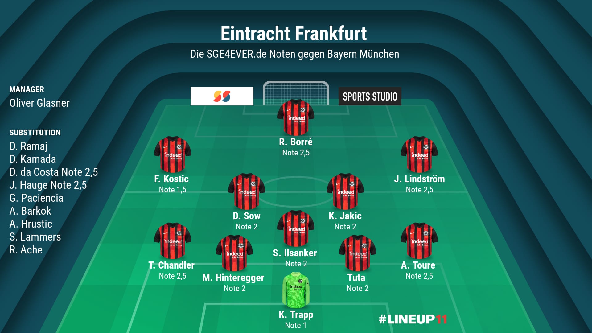 Btw auch bei transfermarkt.de wurde unsere Leistung gewürdigt. Trapp, Hinti und Kostic bei den Spielern und Glasner als Trainer des Spieltags !!