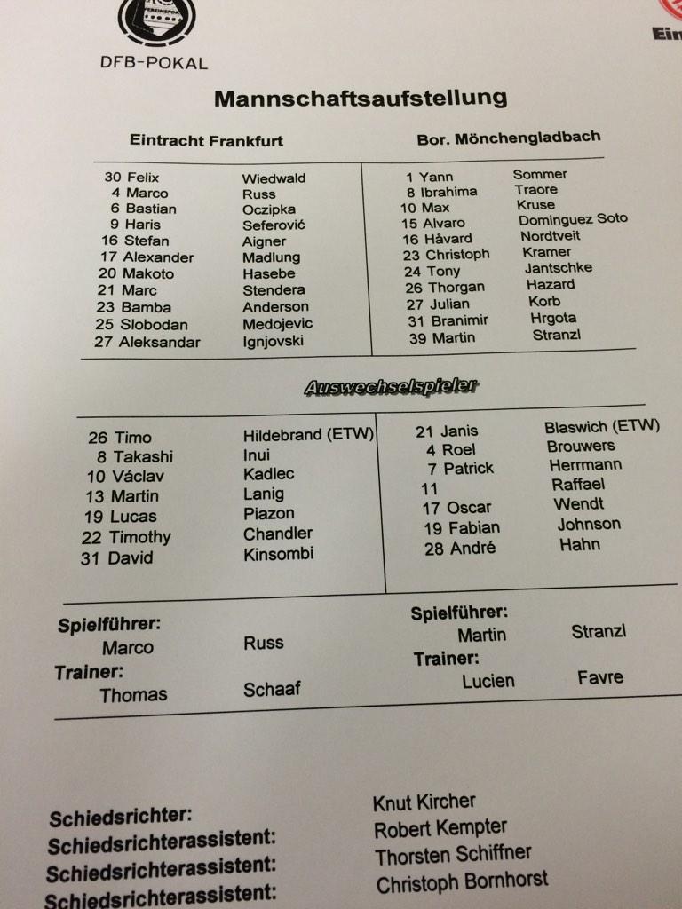 Sicher ist, dass Stürmer Seferovic nach seiner roten Karte gegen Stuttgart, im Pokal mitwirken darf und in der Startelf stehen wird. Sein kongenialer Sturmpartner, Fußballgott Alex Meier, wird leider ausfallen. Aufgrund von muskulären Problemen ist sein Einsatz am Mittwoch nahezu ausgeschlossen, wie Trainer Thomas Schaaf auf der heutigen Pressekonferenz bekannt gab. In der Innenverteidigung könnte Madlung eine weitere Chance von Beginn an erhalten, was bedeuten dürfte, dass Russ und Hasebe weiterhin auf der Sechs abräumen werden. Eine Chance in der Startelf hätte auch Stefan Aigner verdient, der den formschwachen Piazon verdrängen könnte. On Inui erneut in der ersten Elf stehen wird, ist offen. Gegen Stuttgart war auch sein Spiel ein einziges Ärgernis. Kadlec wäre wohl die Alternative.