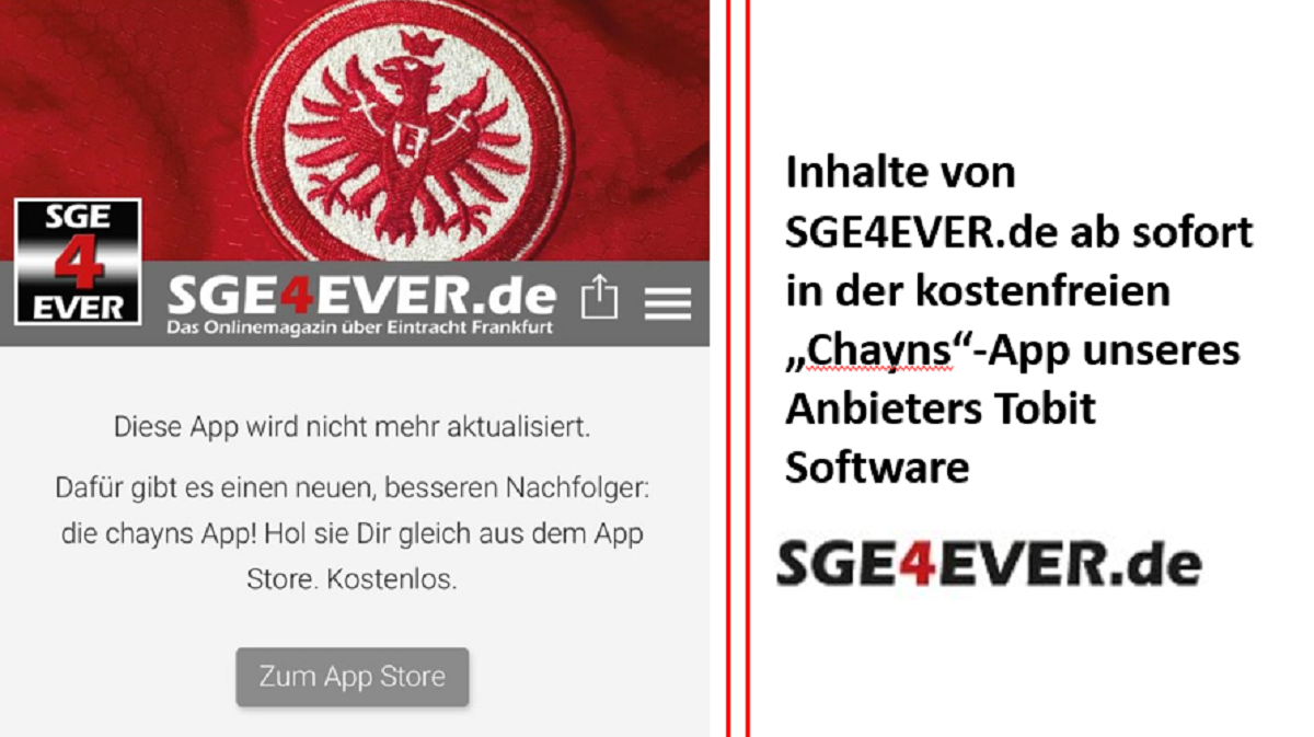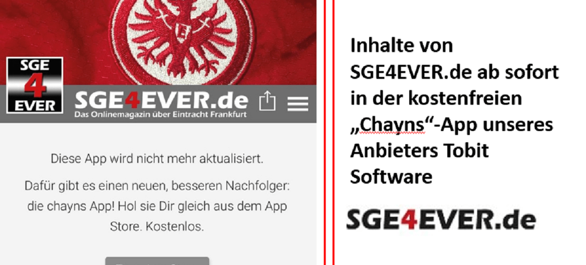 Aktuell gilt diese Umstellung nur für Apple-Nutzer. Nutzer des Google-Playstores sind von der Bereinigung nicht betroffen und können die SGE4EVER.de-App weiterhin ganz normal nutzen. Falls ihr Probleme bei der Umsetzung habt, oder ihr nicht geklärte Fragen habt, meldet euch über unser Kontaktformular!